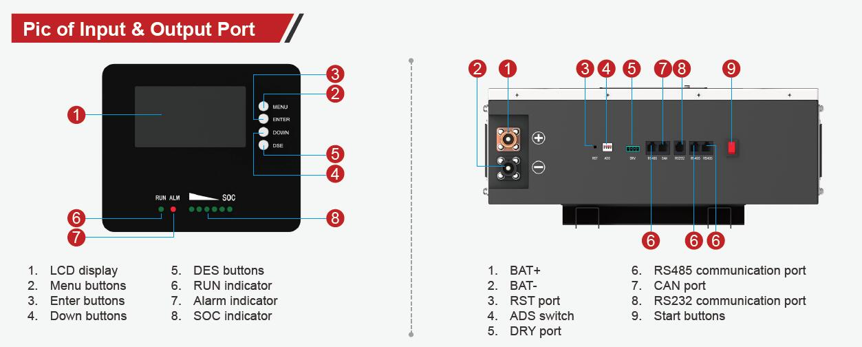 Rated Voltage: 25.6V Rated Capacity: 200Ah Rated Power: 5120Wh Life cycles: 6000 cycles (25°C, 80% DOD) Recommended charging voltage: 29.2V Charging Current: Recommended: 40A / Maximum: 150A Final discharge voltage: 22V Discharge Current: Recommended: 100A / Maximum: 150A Breaking voltage: Charge: 29.2V / Discharge: 22.0V (2s) Operating temperature: 0 ~ 45°C (charging) / -10 ~ 55°C (discharging) Storage temperature: -5~35°C Parallel module: Up to 15 units Communication: CAN2.0 / RS232 / RS485 Read more